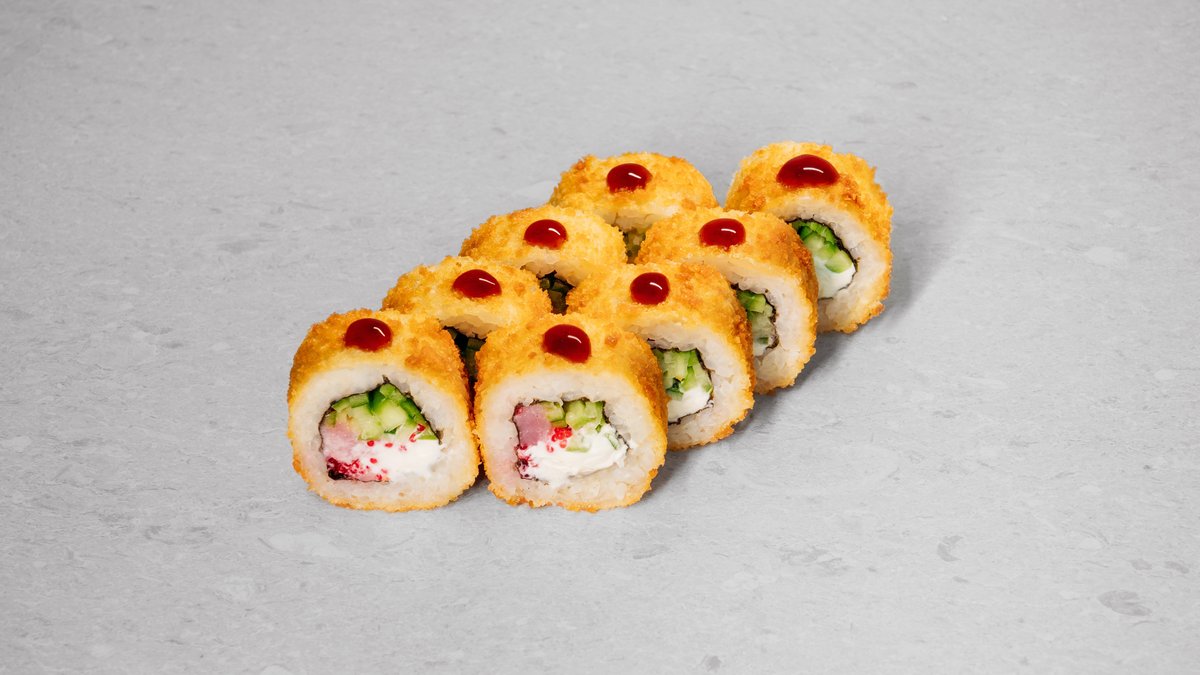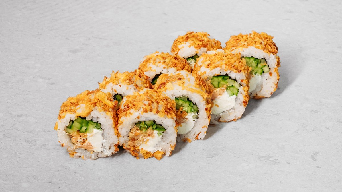 Rice, nori, cream cheese, tuna fried in panko, cucumber, red tobiko