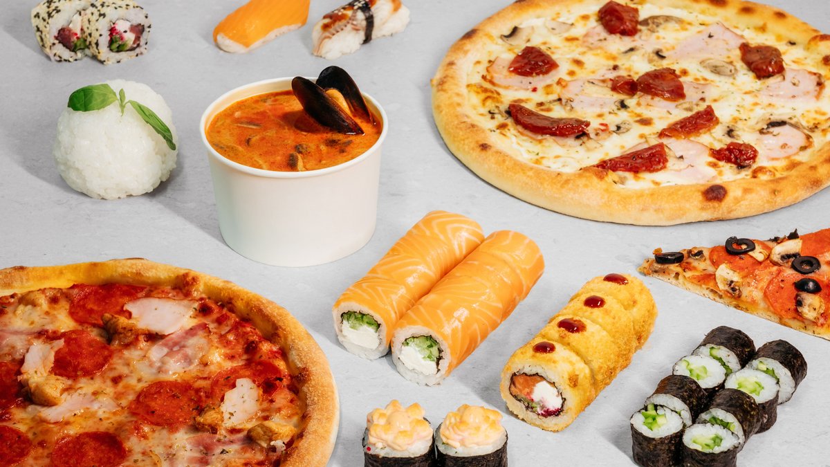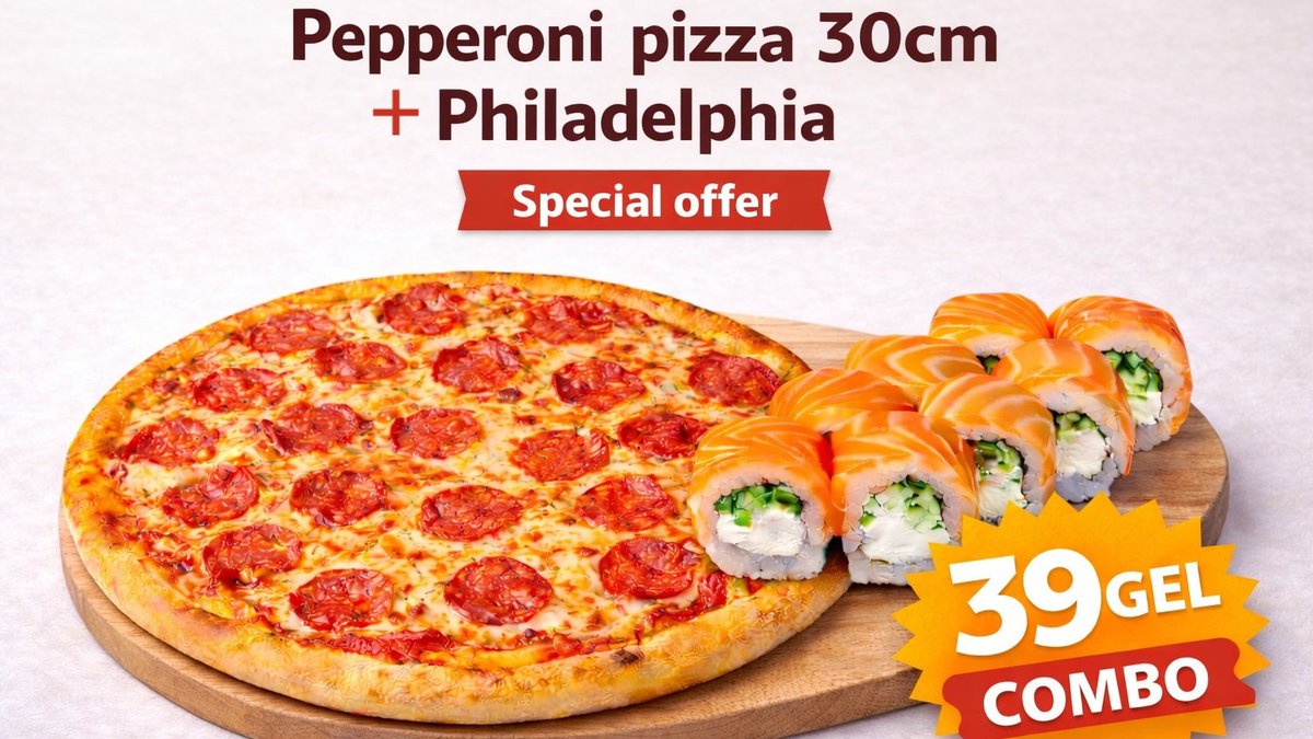 Pepperoni pizza (Dough, pizza sauce, pepperoni, mozzarella cheese) + Philadelphia (Rice, nori, cream cheese, cucumber, salmon, red tobiko)
