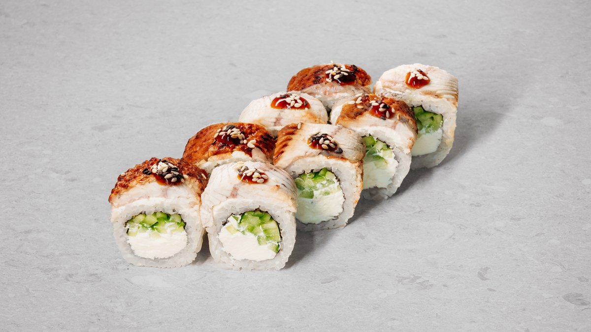 Rice, nori, cream cheese, cucumber, eel (unagi), unagi sauce, sesame