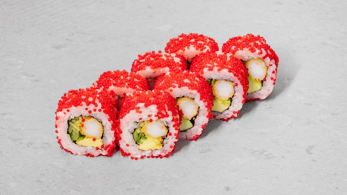 Rice, nori, avocado, cucumber, crab, red tobiko, cream cheese