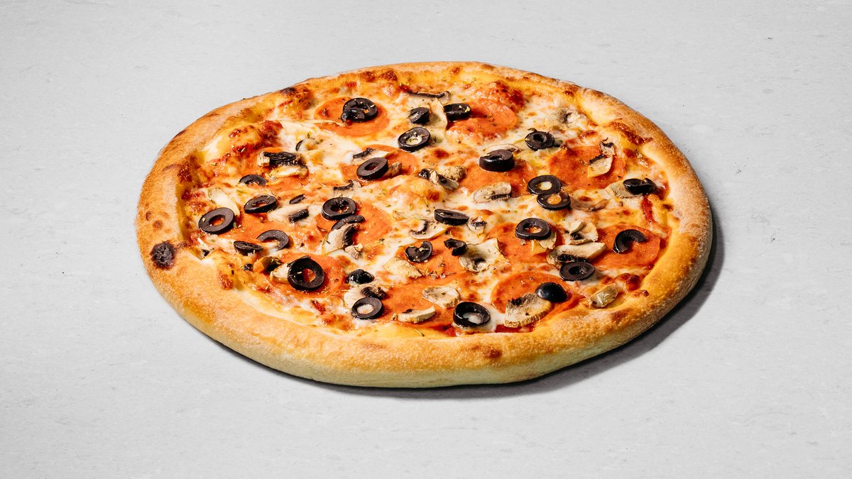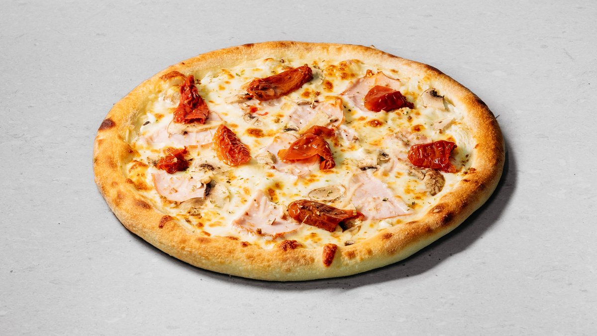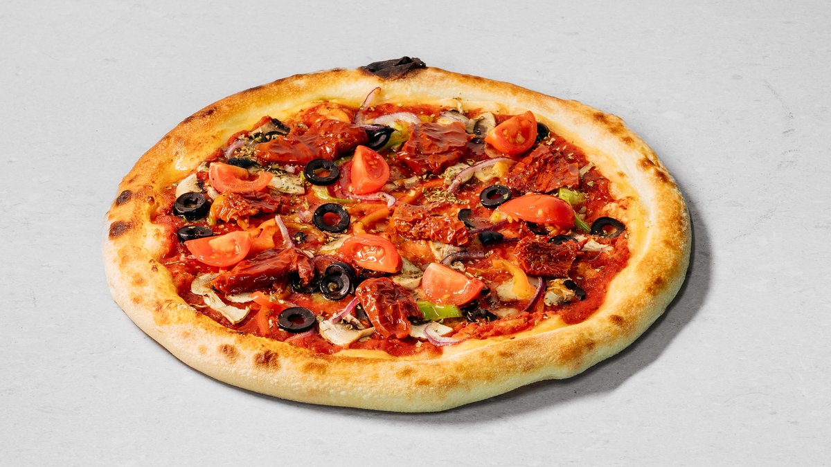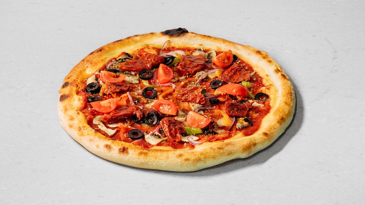 Dough, pizza sauce, tomatoes, mushrooms, sweet pepper, olives, onion, sun-dried tomatoes, olive oil