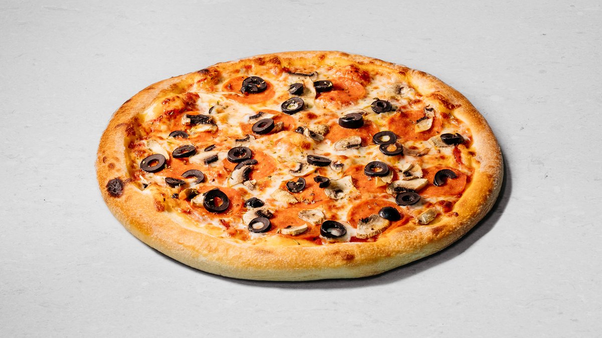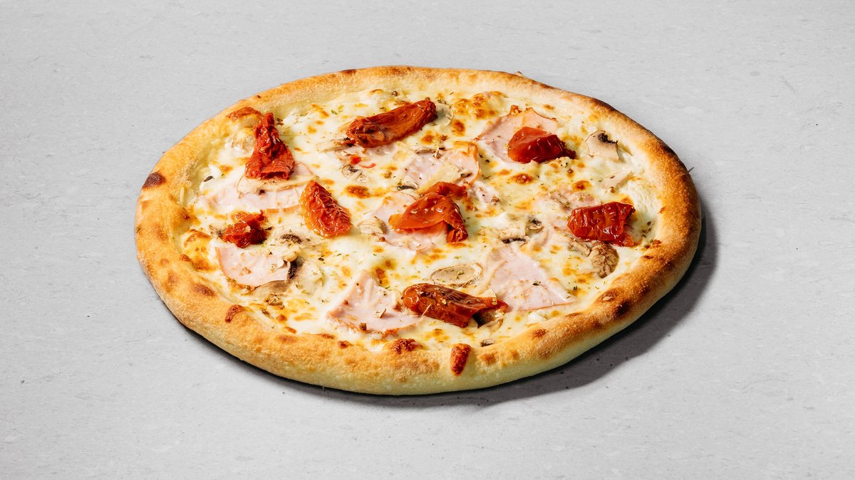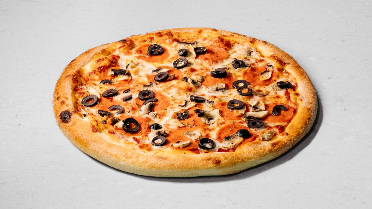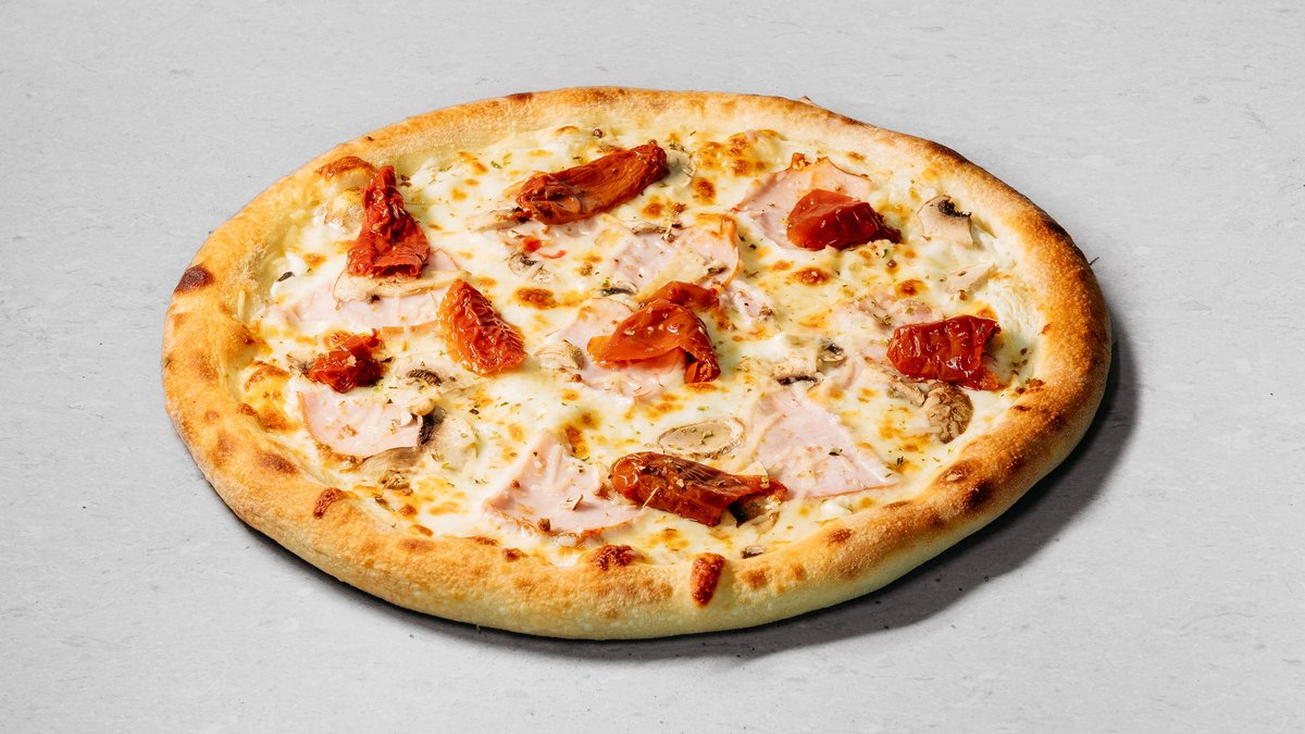 Dough, pizza sauce, tomatoes, mushrooms, sweet pepper, olives, onion, sun-dried tomatoes, olive oil