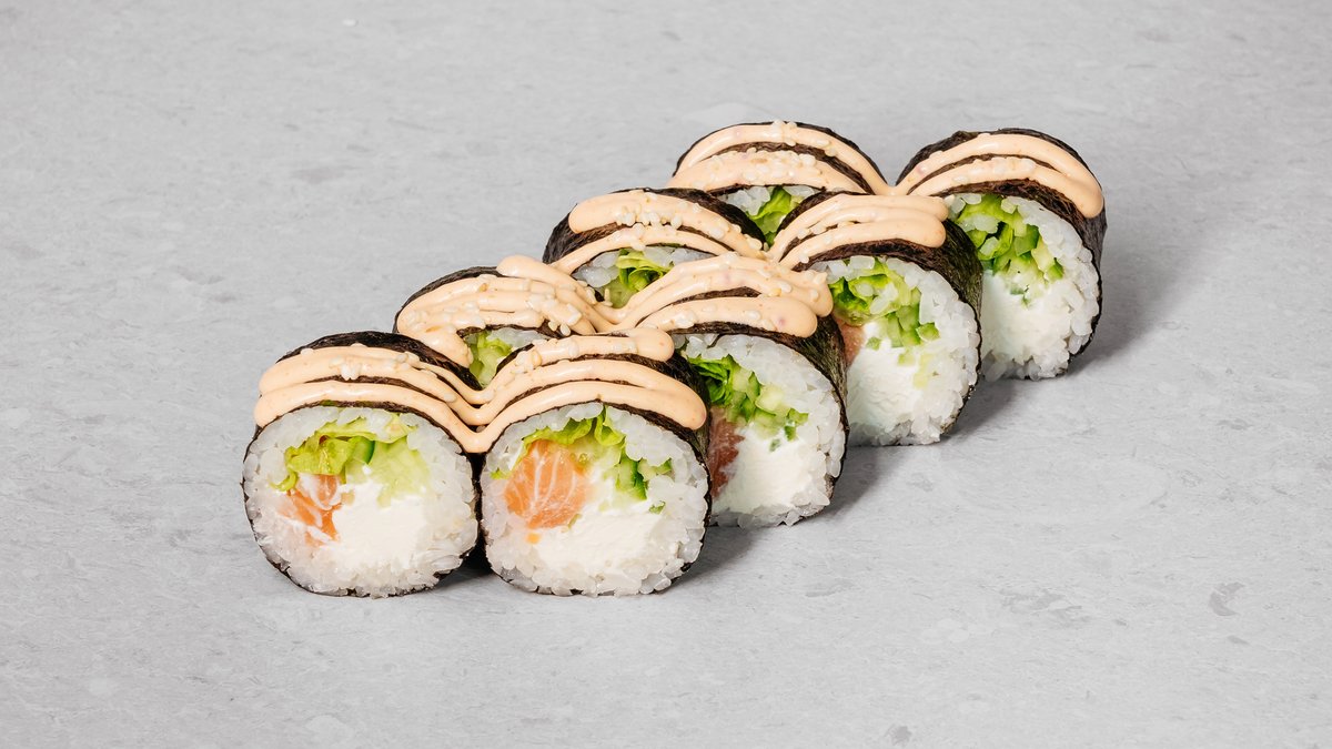 Rice, nori, cream cheese, cucumber, salmon, spicy sauce, white sesame