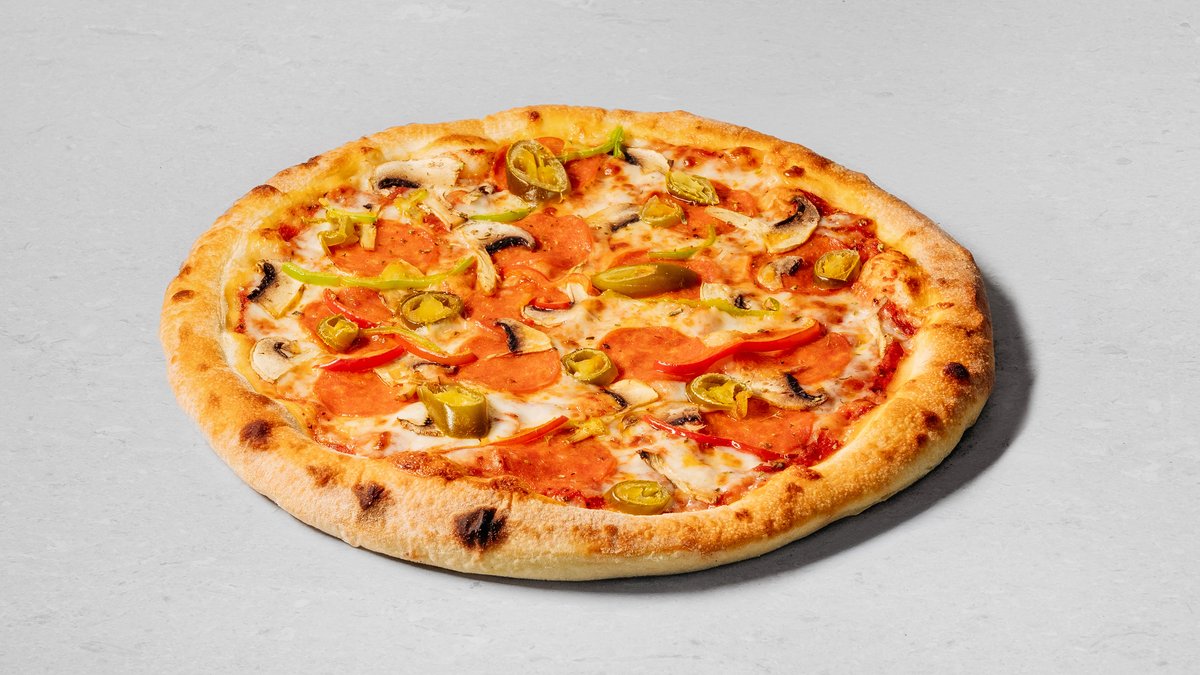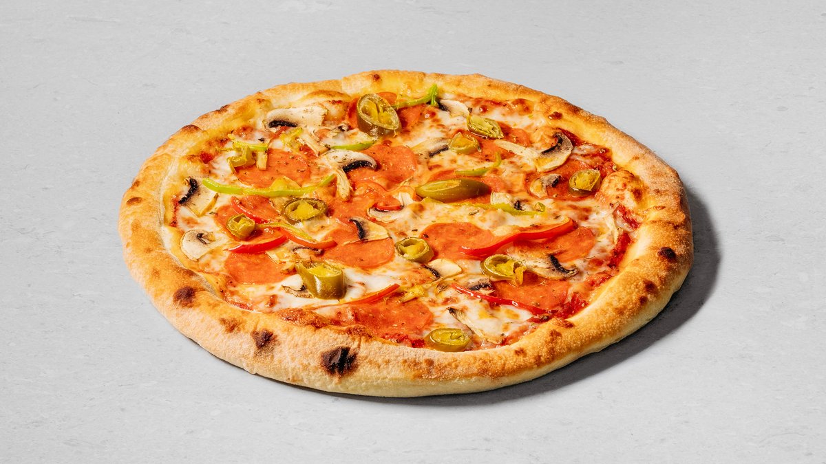 Dough, pizza sauce, mozzarella cheese, pepperoni, mushrooms, sweet pepper, jalapeño, Tabasco hot sauce