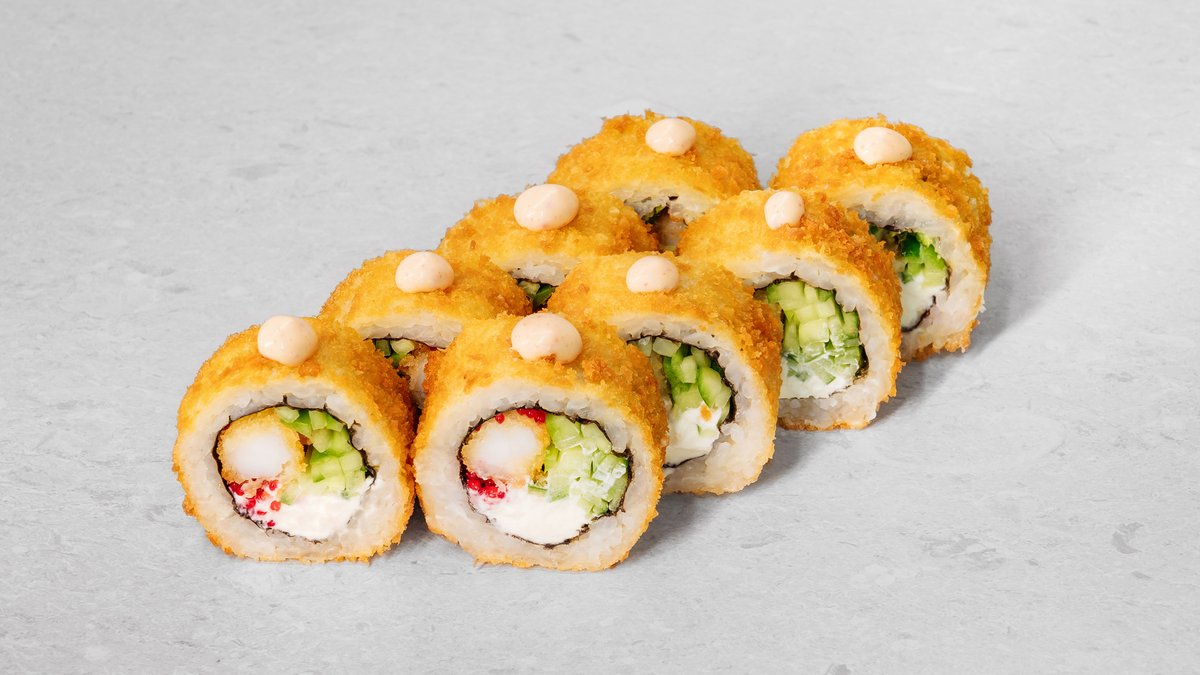Rice, nori, cream cheese, shrimp fried in panko, cucumber, red tobiko