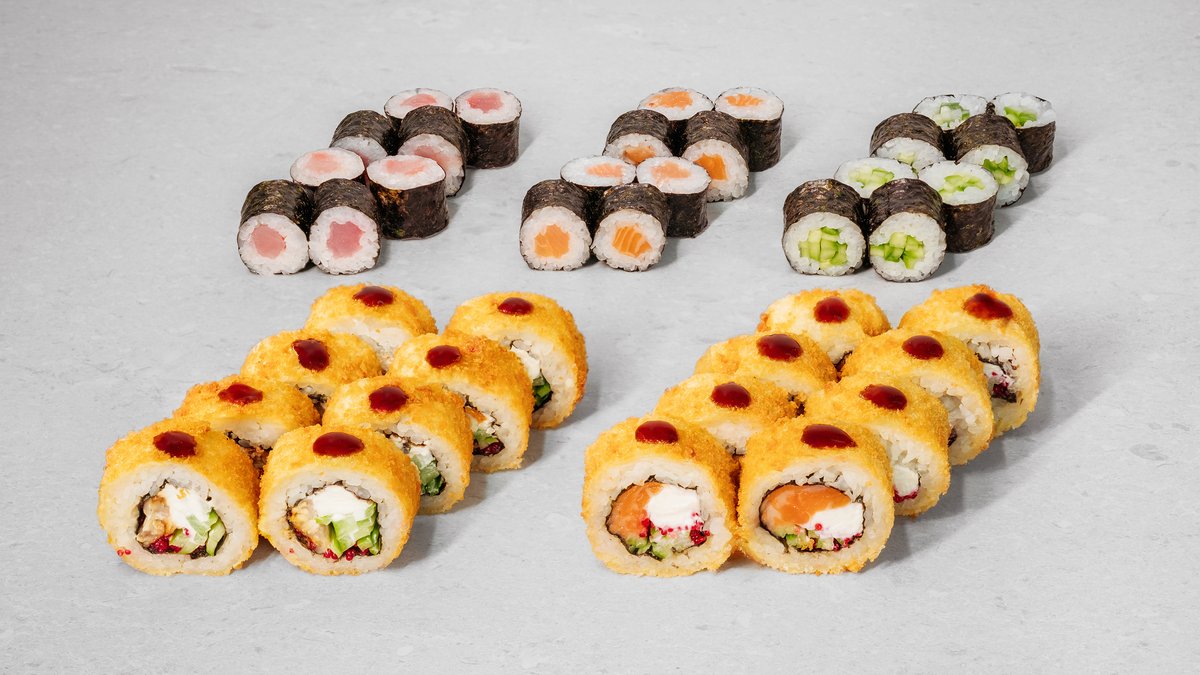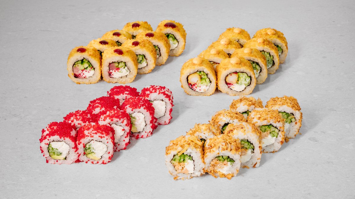 Baked salmon roll, tuna tempura, cucumber maki, Philadelphia roll