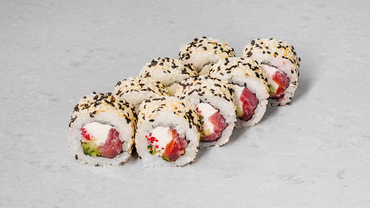 Rice, nori, cream cheese, tuna, red tobiko, cucumber, spicy sauce, sesame