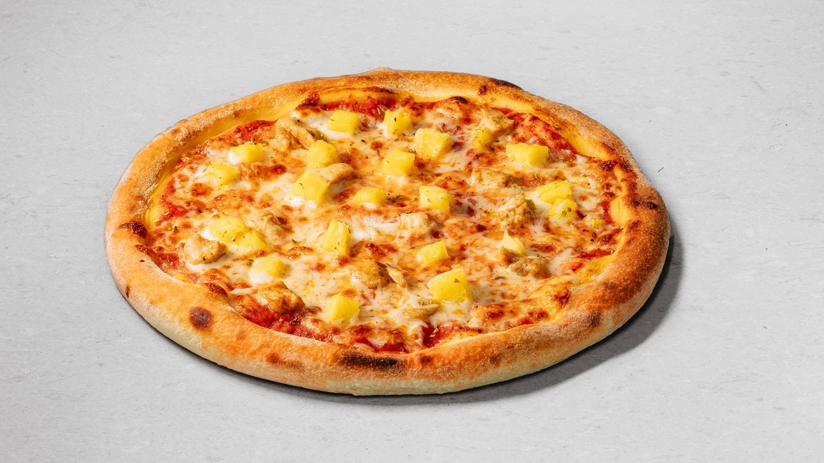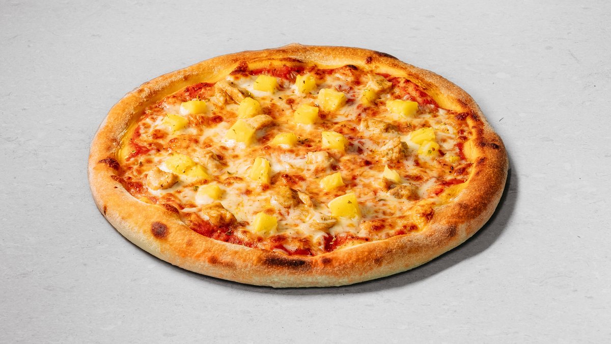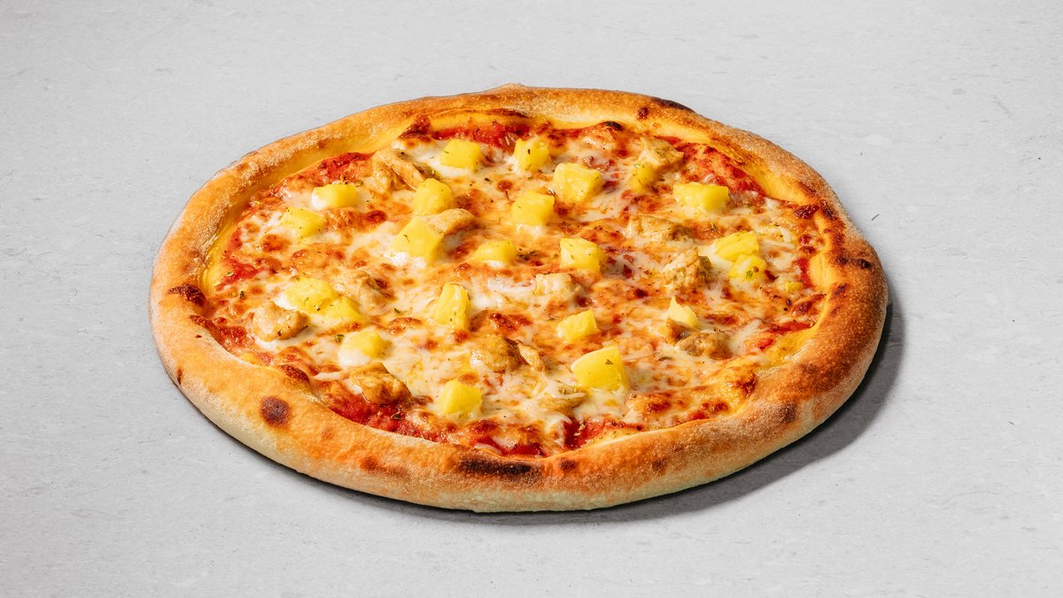 Dough, pizza sauce, mozzarella, chicken fillet, pineapple, parmesan cheese