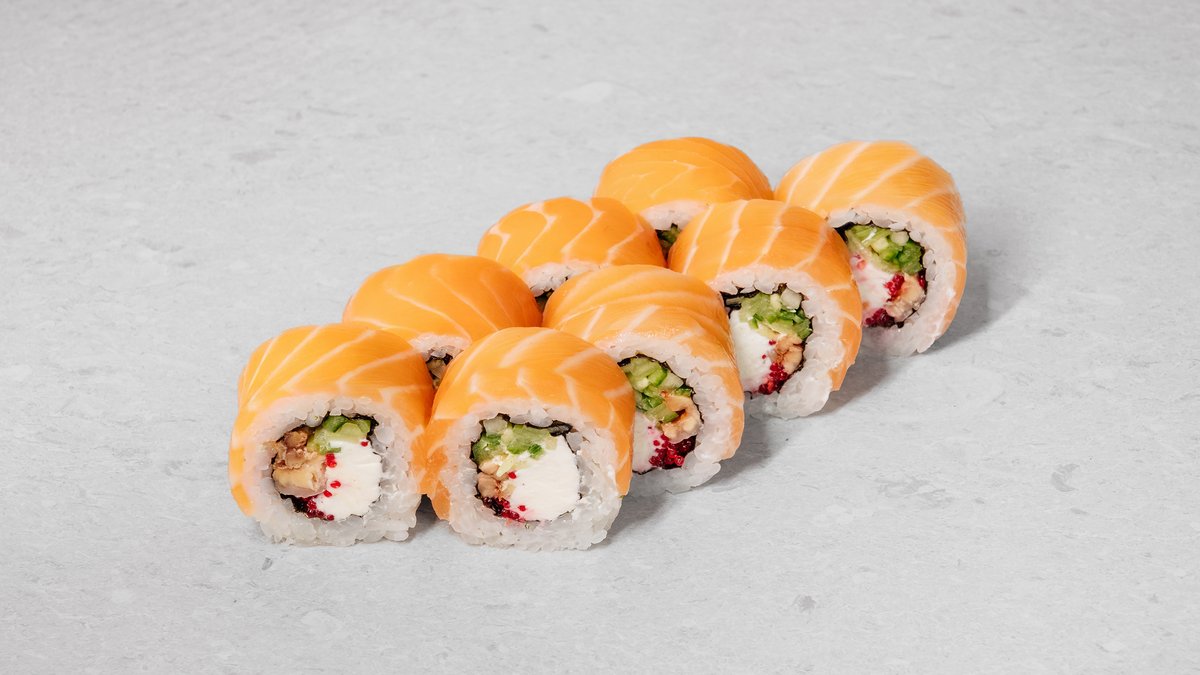 Rice, nori, cream cheese, cucumber, eel (unagi), salmon, red tobiko