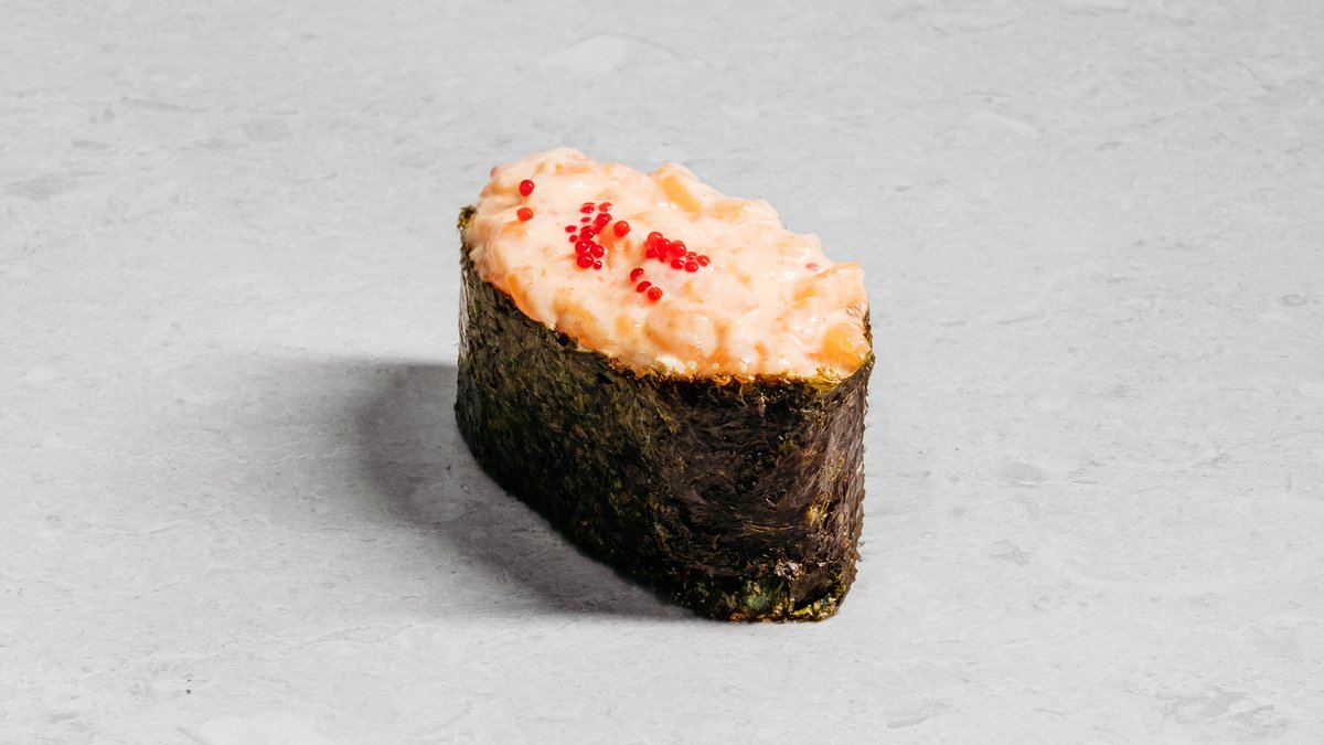 Rice, nori, salmon, spicy sauce, sesame