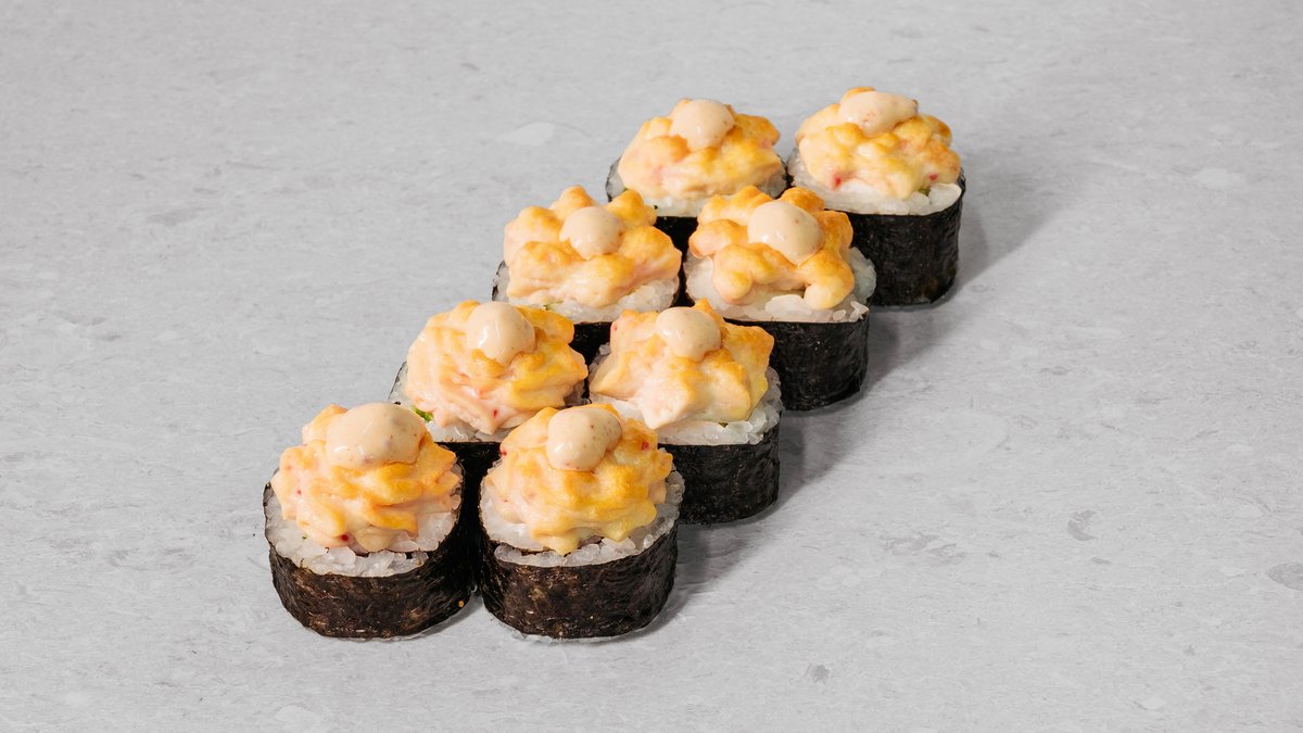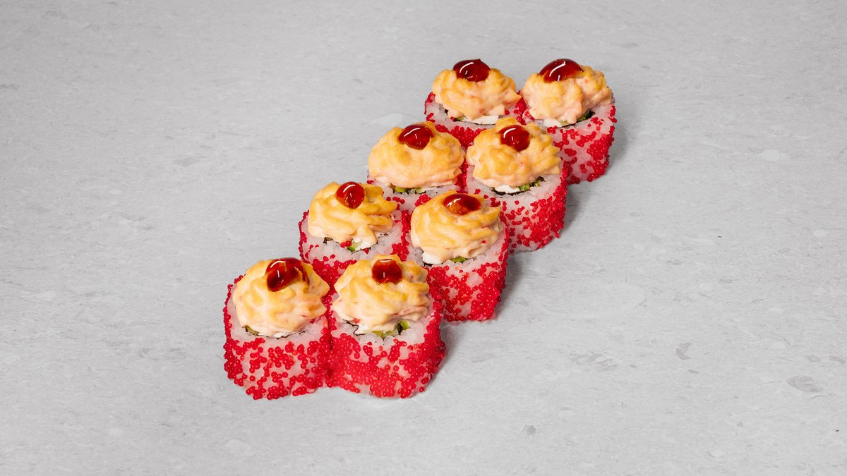 Rice, nori, avocado, cucumber, fried shrimp in panko, red tobiko, spicy sauce
