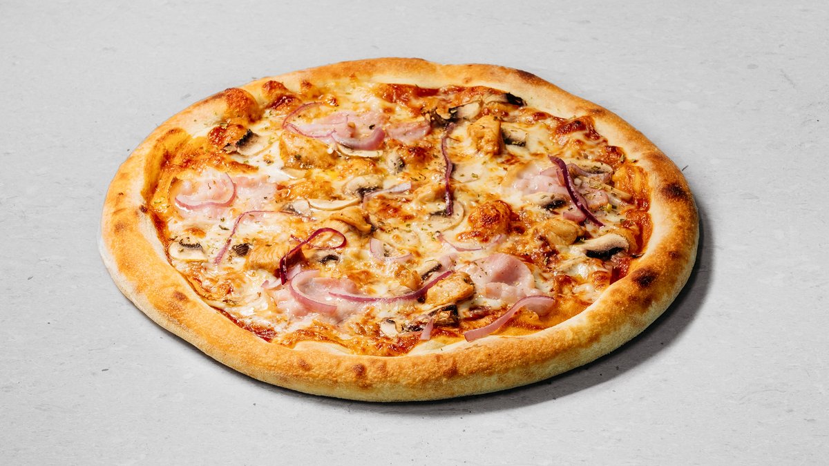 Dough, barbecue sauce, mozzarella cheese, mushrooms, bacon, onion, chicken fillet