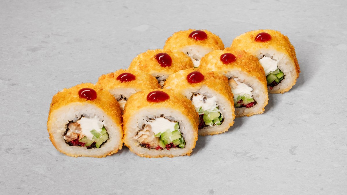 Rice, nori, cream cheese, eel fried in panko, cucumber, red tobiko