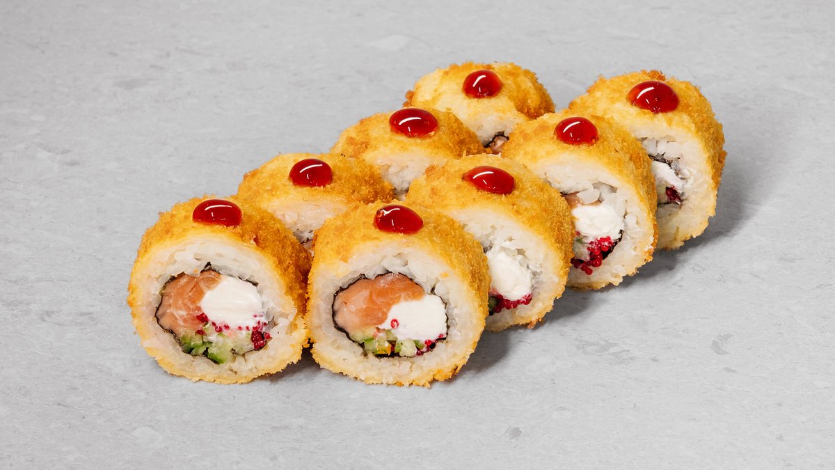 Rice, nori, cream cheese, salmon fried in panko, cucumber, red tobiko