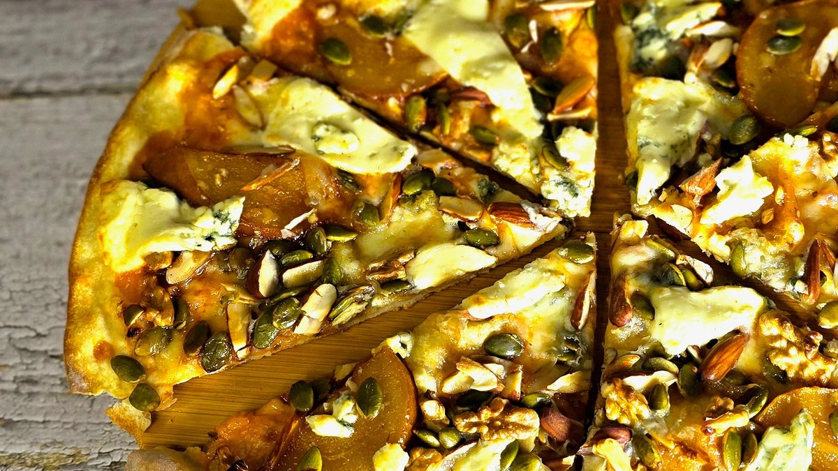 ტკბილ-ცხარე სოუსი, მსხალი , გაუდა, როკფორი , მოხალული ნიგოზი, ნუში და გოგრის თესლი