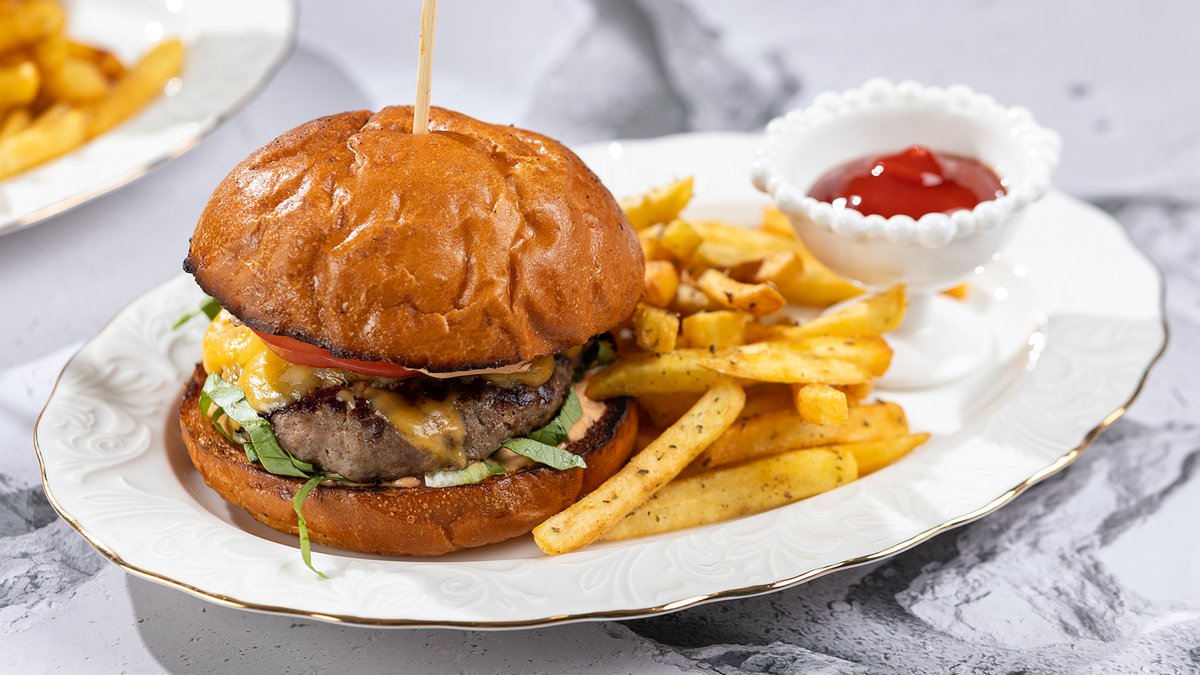 Beef patty, onions, sauce, cheddar cheese. Lettuce, tomato
