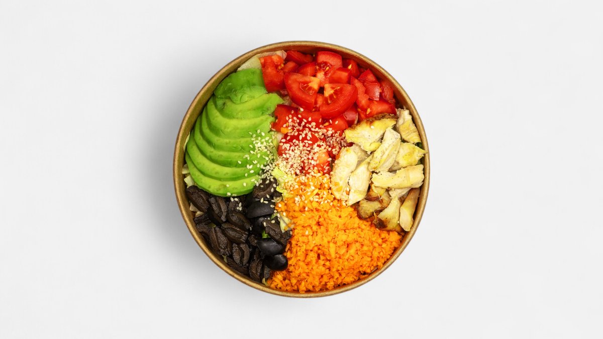 Chicken fillet, avocado, lettuce, tomato, carrot, olives
