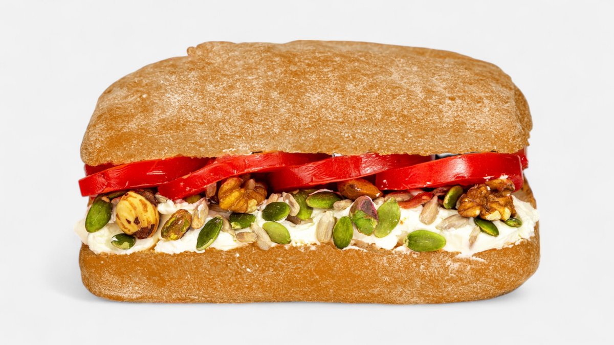 Ciabatta bread, white cheese, fresh tomato, walnuts, seeds