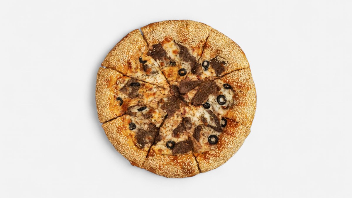 American dough, beef steak, beef deli meat, pizza cheese, olives, garlic sauce