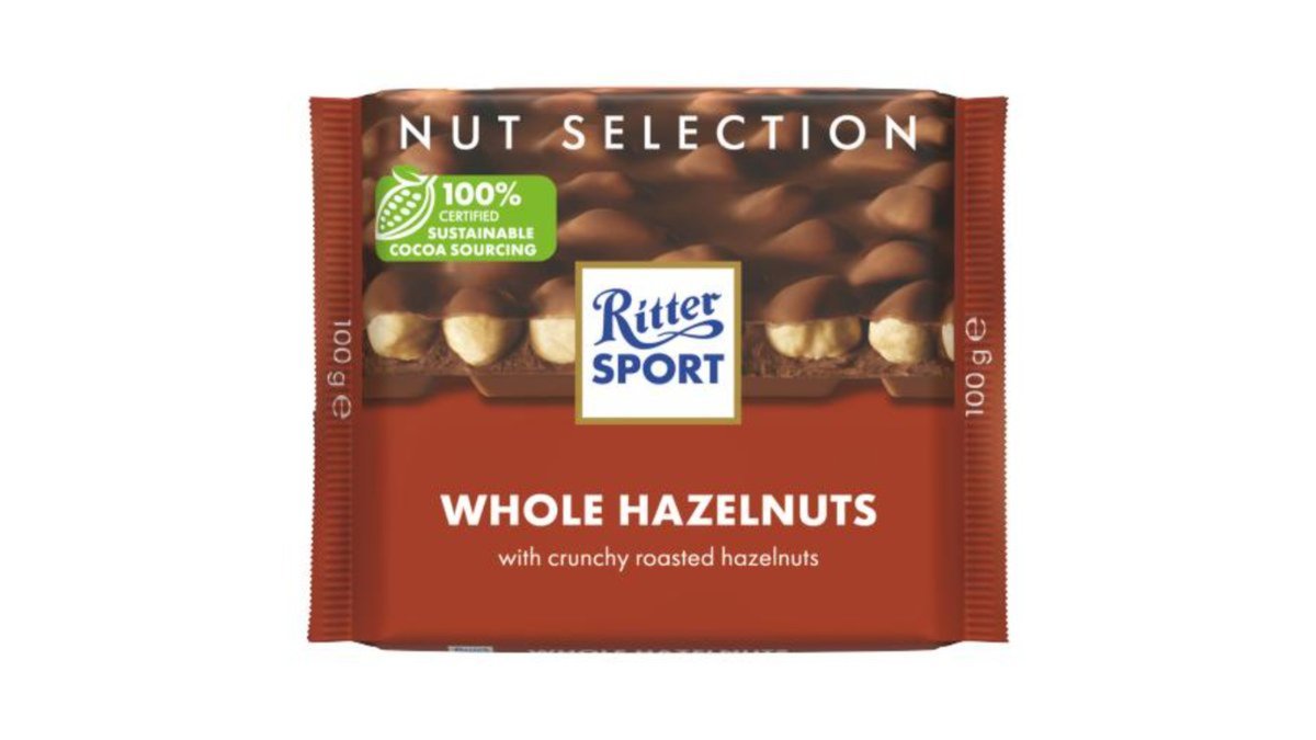 შოკოლადი /რიტერ სპორტი/ რძიანი, მთლიანი თხილით 700001 /10*100 გ