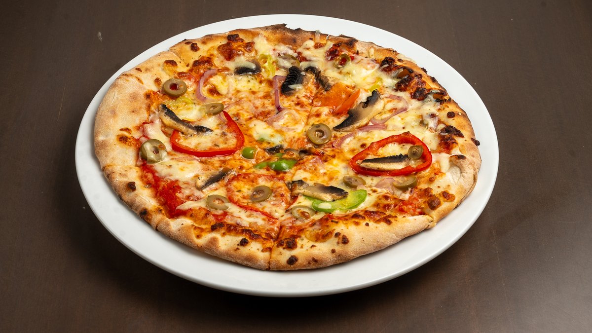 Ζύμη πίτσας, ελιές, κρεμμύδι, πιπεριά, μανιτάρια, τυρί, σάλτσα τομάτας