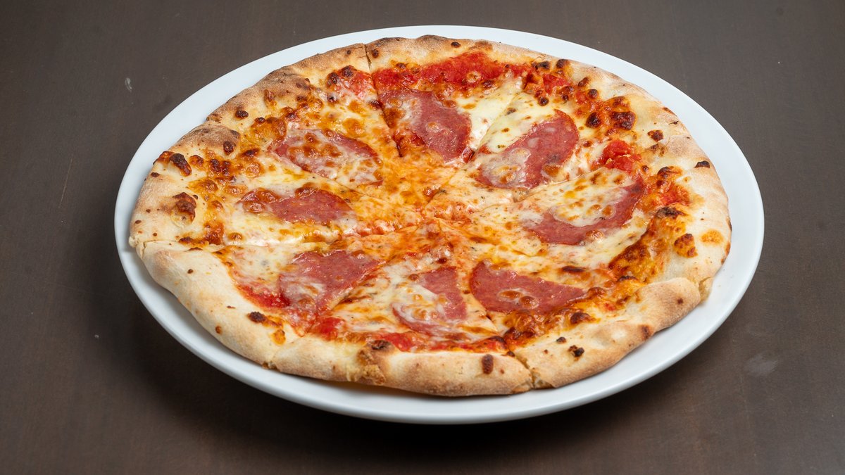 Ζύμη πίτσας, σάλτσα τομάτας, σαλάμι, μοτσαρέλα