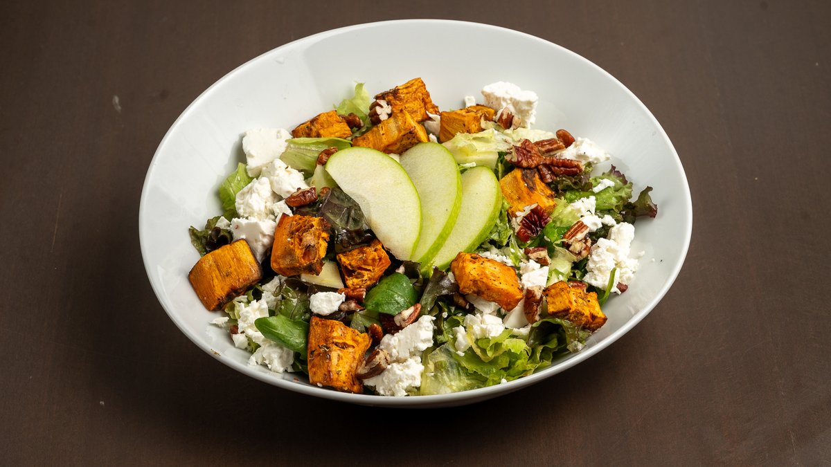 Κατσικίσιο τυρί, ρόκα, καρύδια, μήλο, ψητή γλυκοπατάτα, dressing με χυμό λεμόνι, ελαιόλαδο, θυμάρι, μουστάρδα