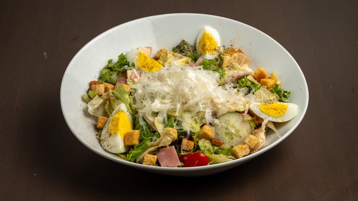 Πράσινη σαλάτα ανάμεικτη, τοματίνια, αγγούρι, γκούντα, ζαμπόν, κρουτόν, αυγό γραβιέρα σως