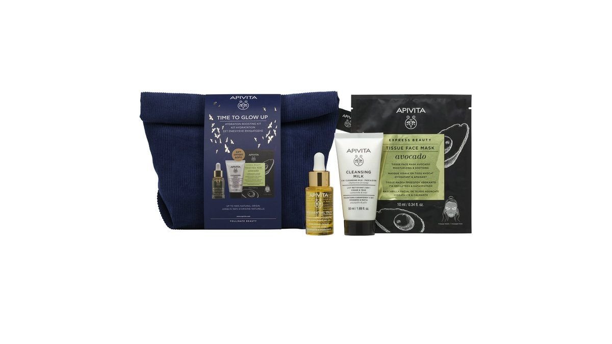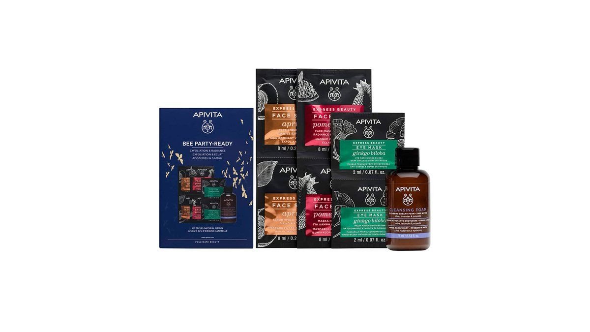 Apivita Promo Bee Party-Ready Express Beauty Scrub Προσώπου με Βερύκοκο 2X8 ml Μάσκα Προσώπου με Ρόδι 2X8 ml Μάσκα Ματιών με Gin kgo Biloba 2X2 ml & Αφρός Καθαρισμού με Ελιά Λεβάντα & Πρόπολη 75 ml