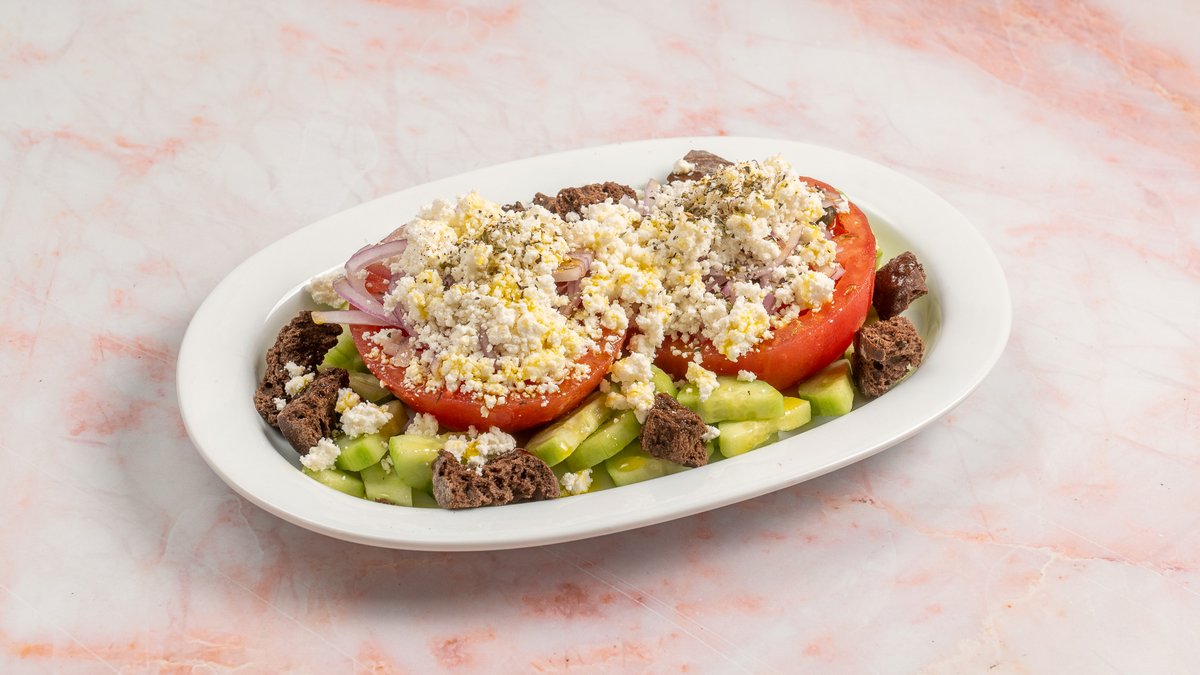 Με φέτα, παξιμάδι χαρουπιού, κρεμμύδι, αγγούρι και κάπαρη