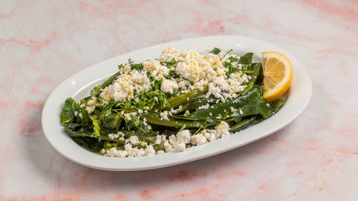 Με χόρτα εποχής, ξινομυζήθρα, δυόσμο, λεμόνι, τηγανητό τραχανά και λαδολέμονο