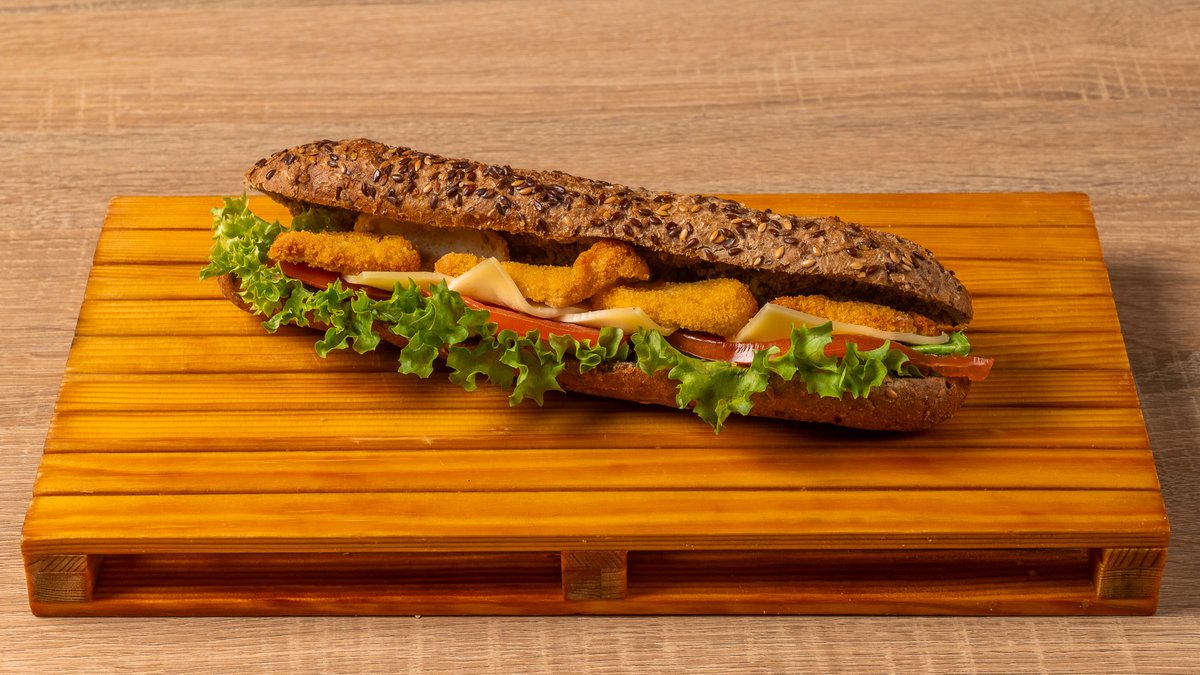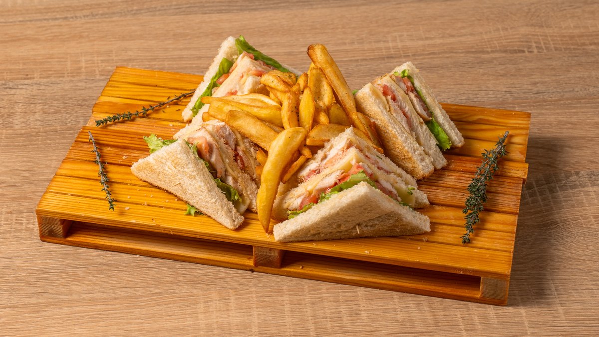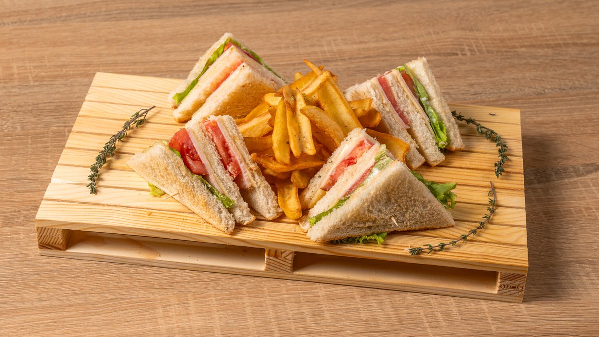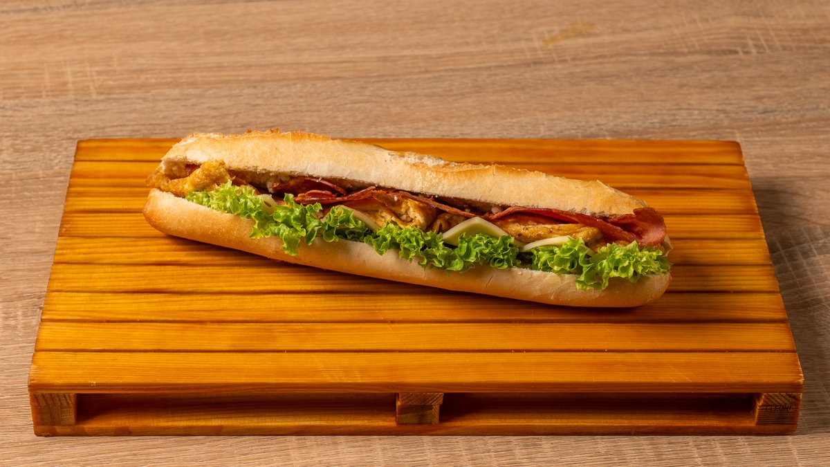 Με ζαμπόν, τυρί, μπέικον, ντομάτα, μαρούλι και μαγιονέζα. Συνοδεύεται από πατάτες τηγανητές