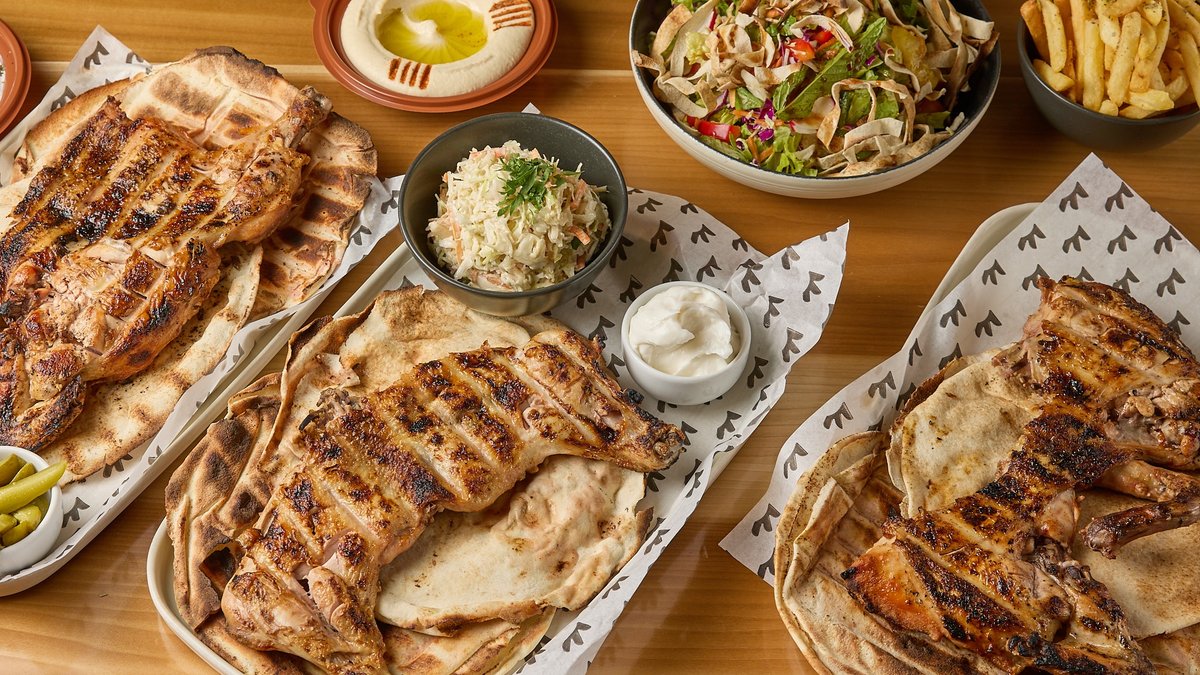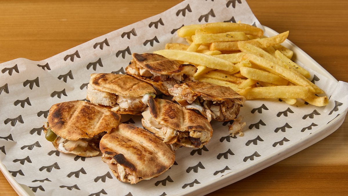 6 κομμάτια μικρής Αραβικής πίτας, κοτόπουλο, πατάτες τηγανητές, πίκλες, σως σκόρδου, πικάντικη σως (λίγο καυτερή)