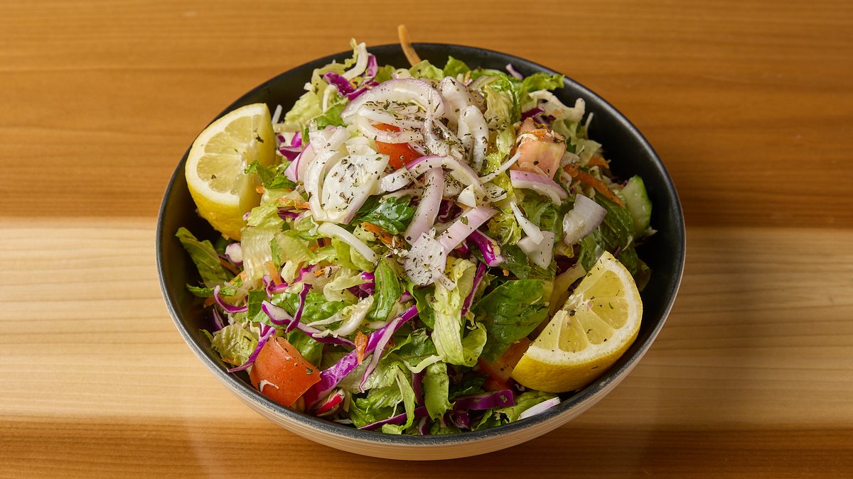 Μαρούλι, λάχανο, ντομάτα, αγγούρι, πράσινη πιπεριά, σιρόπι ροδιού