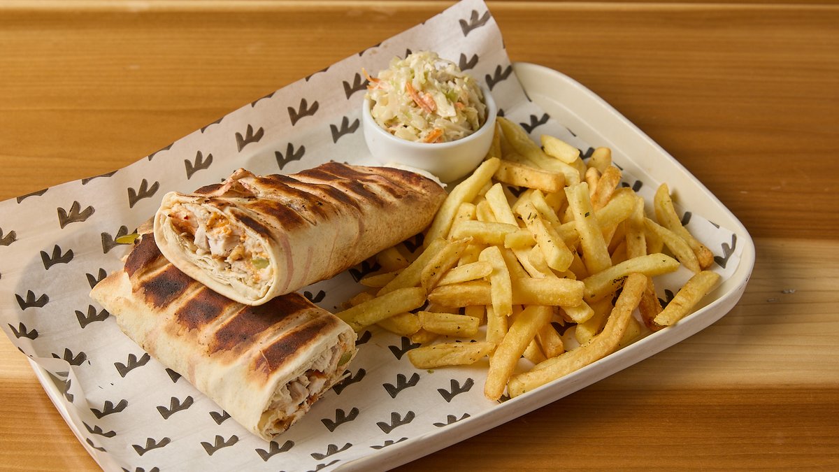 Αραβική πίτα, κοτόπουλο, πατάτες τηγανητές, coleslaw, πίκλες, σως σκόρδου, πικάντικη σως (λίγο καυτερή)