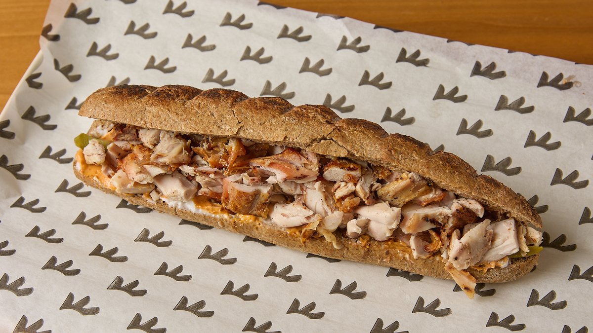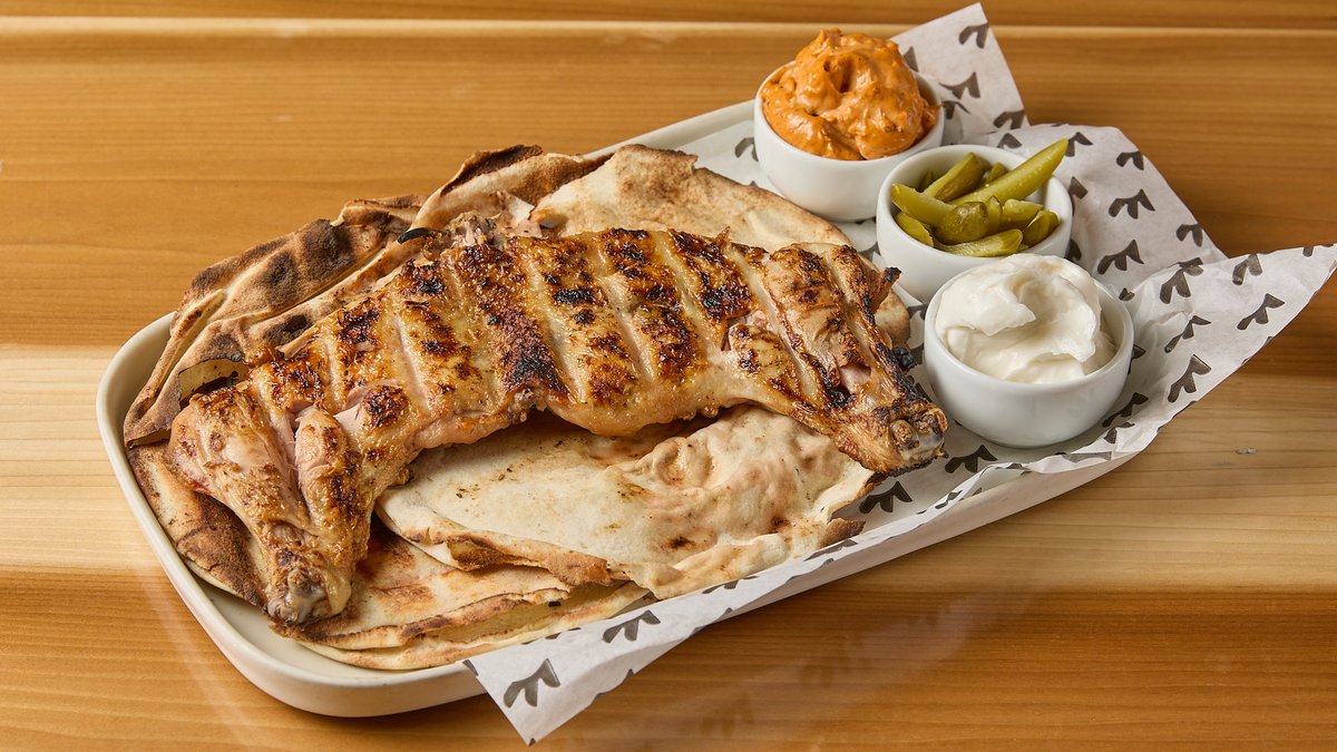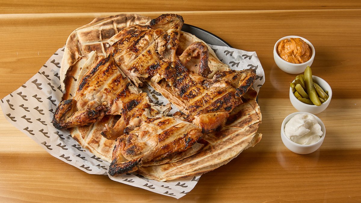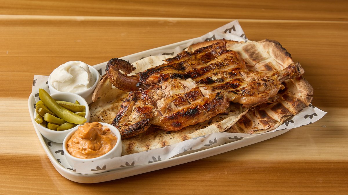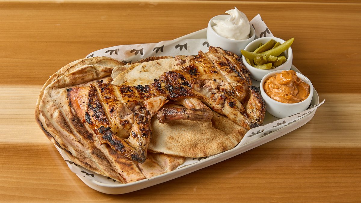 Μπακέτα ολικής, κοτόπουλο, πίκλες, σως σκόρδου, πικάντικη σως (λίγο καυτερή)