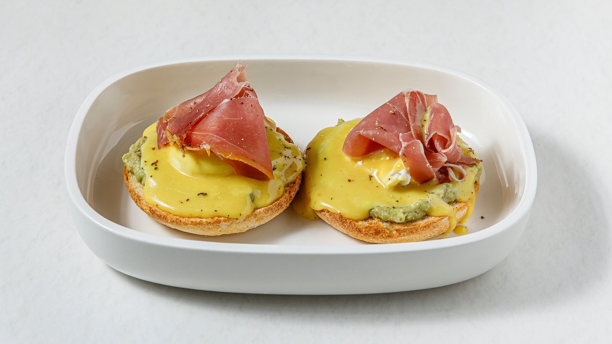 Ποσέ αυγά πάνω σε ψωμί English Muffin με σάλτσα Hollandaise.
