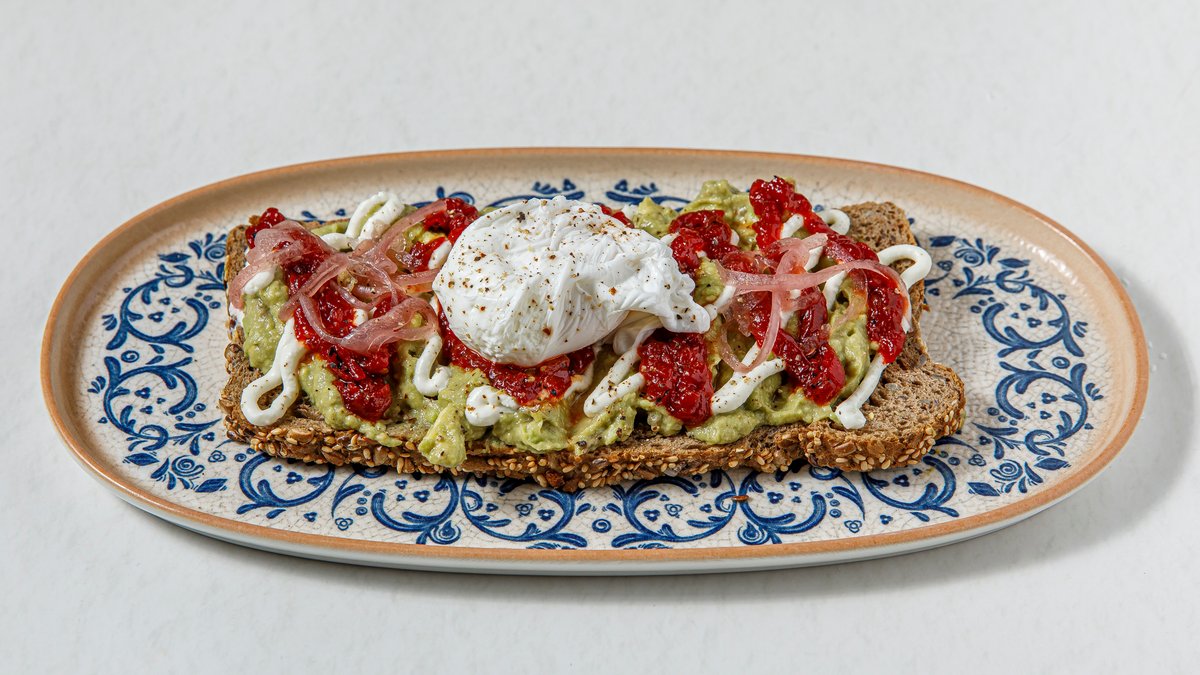 Guacamole, αυγό ποσέ, σάλτσα πιπεριάς, φέτα και κρεμμύδι τουρσί σε ψωμί Dinkel