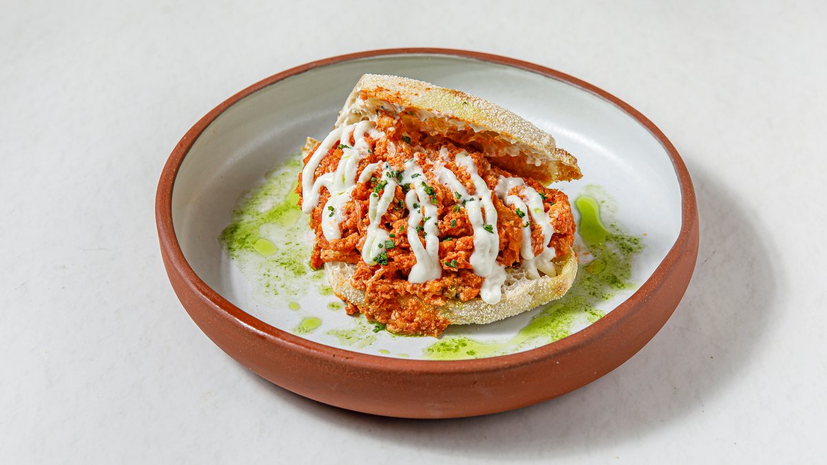 Καγιανας με φρέσκια τομάτα , γραντιναρισμένη φέτα, φρέσκια ρίγανη, σε ψωμί panini