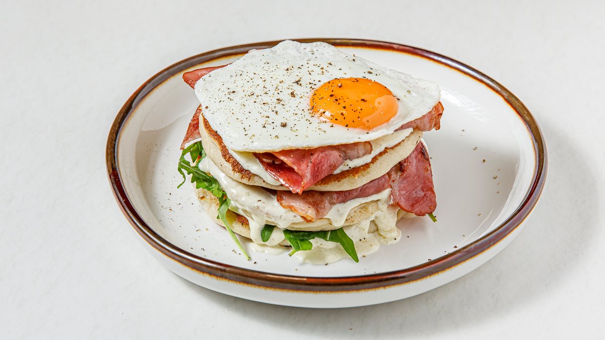 Αλμυρά pancakes με τηγανητό αυγό, ρόκα, bacon και κρέμα παρμεζάνας