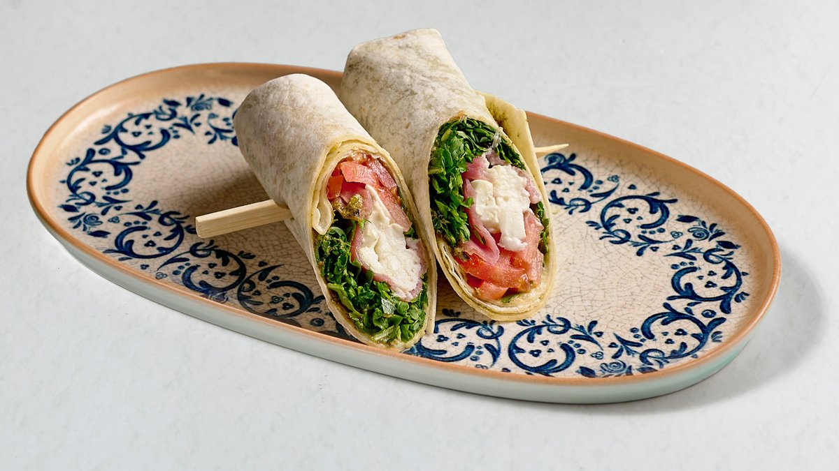 Φρέσκια μοτσαρέλα, προσούτο di parma, τομάτα, baby ρόκα, πέστο βασιλικού σε τορτίγια