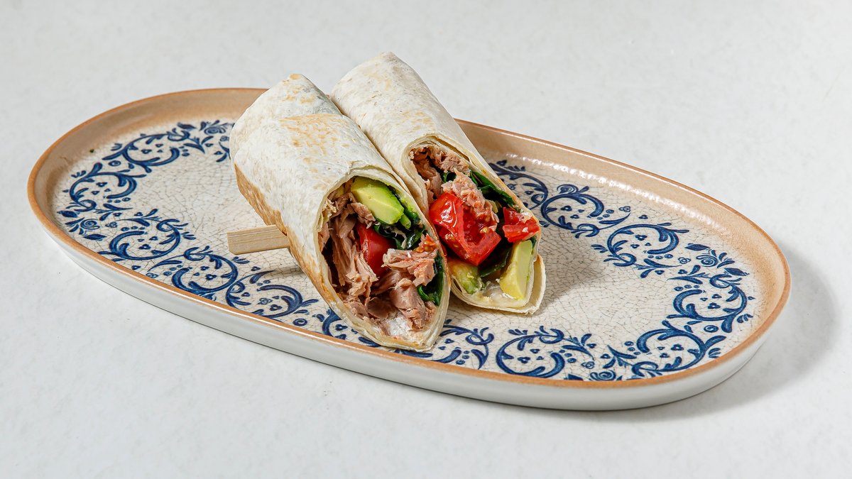 Τόνος, αβοκάντο, τοματίνια, baby σπανάκι και γιαούρτι σε τορτίγια