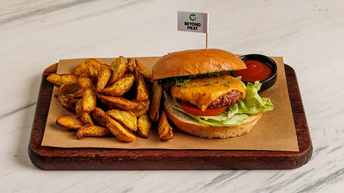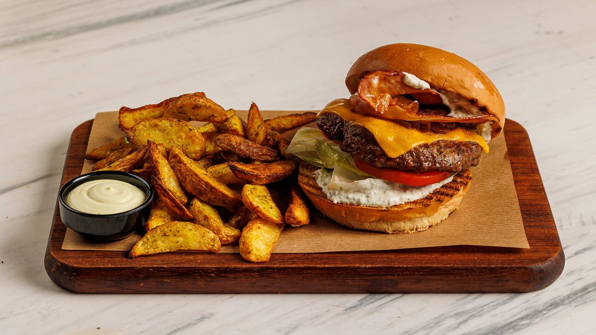 Με μπιφτέκι από μοσχαρίσιο black Angus, cheddar, μαρούλι, ντομάτα, σως και φρέσκες τηγανητές πατάτες