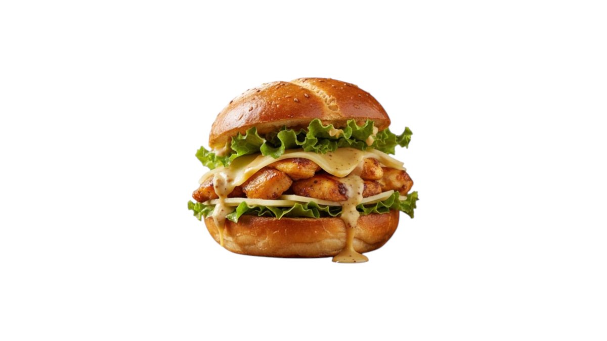 Με κοτόπουλο, μπέικον, τυρί, μαρούλι, ντομάτα, σως και φρέσκες τηγανητές πατάτες