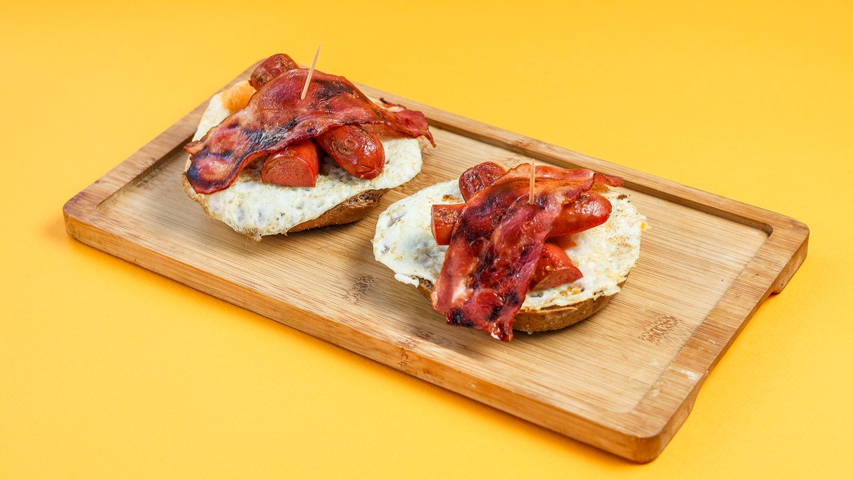 Με 2 αυγά, μπέικον, λουκάνικο και σως της επιλογής σου