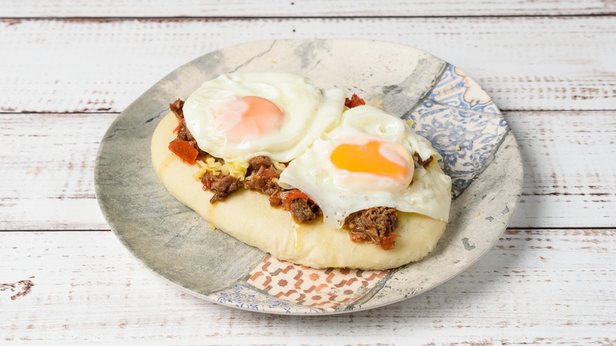Με βουβαλίσιο καβουρμά, ντομάτα, 2 αυγά τηγανητά και gouda