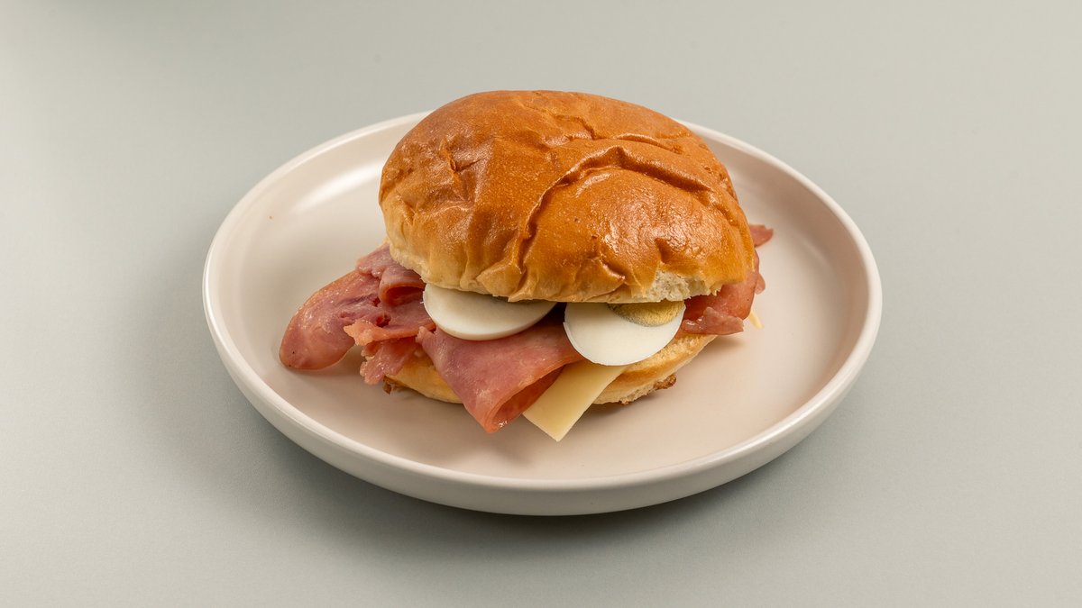 With chicken fillet, cheese, turkey, lettuce, tomato and mayonnaise. Accompanied by fries
