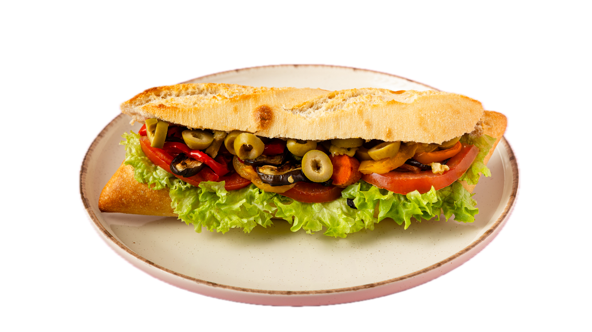 With veggie burger, tomato, cucumber, mushrooms and ketchup
