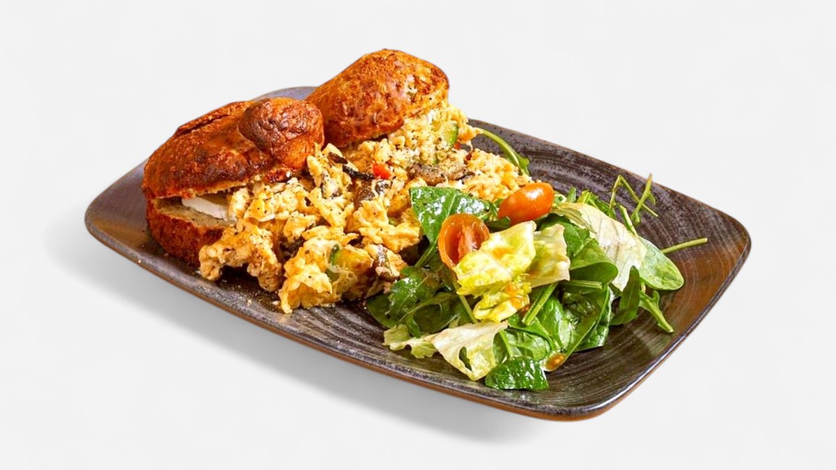 Με scrambled eggs, γραβιέρα, φέτα, μανιτάρι, κολοκύθι και πιπεριά
