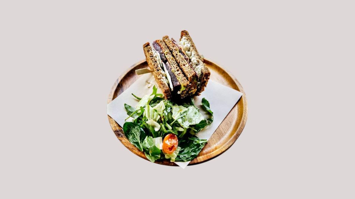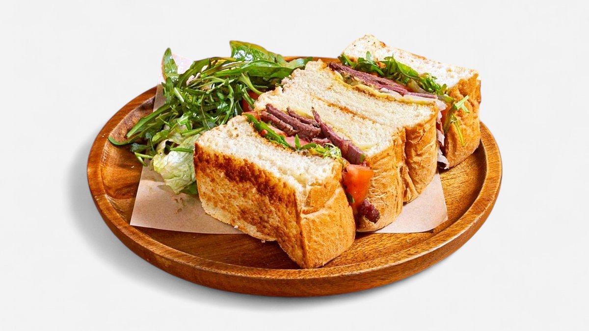 Χειροποίητο παστράμι, μουστάρδα, παρμεζάνα, τομάτα, ρόκα, αγγουράκι τουρσί σε ψωμάκι brioche